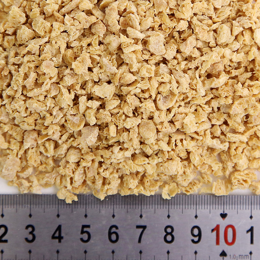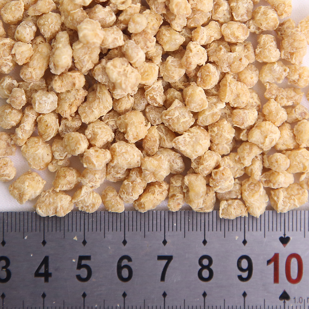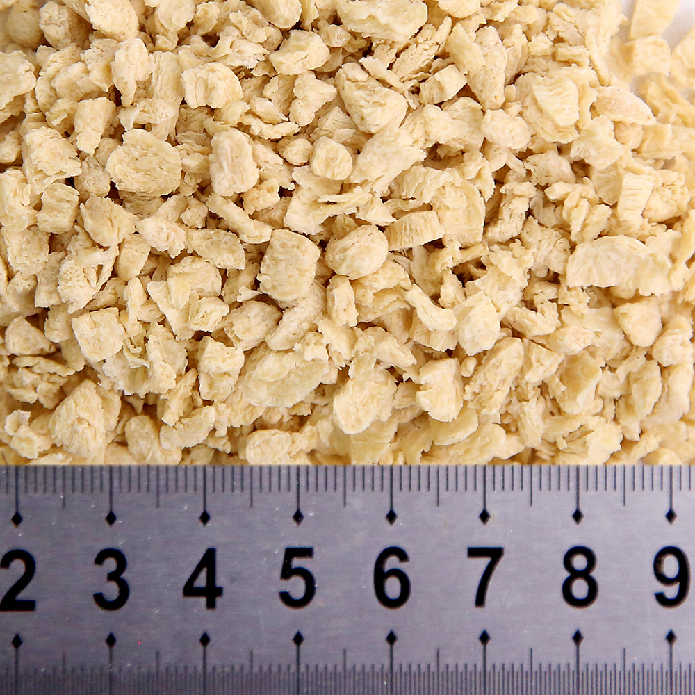 该产品是将分离蛋白、大豆浓缩蛋白、低温豆粕、谷朊粉、淀粉依产品配方比例经挤压膨化、高温高压处理而成,具有良好的吸水性、保油性和类似肉的纤维结构,富有咀嚼感,是一种理想的高蛋白肉制品添加物、休闲豆制品的辅料。产品类型包括TW系列、TB系列